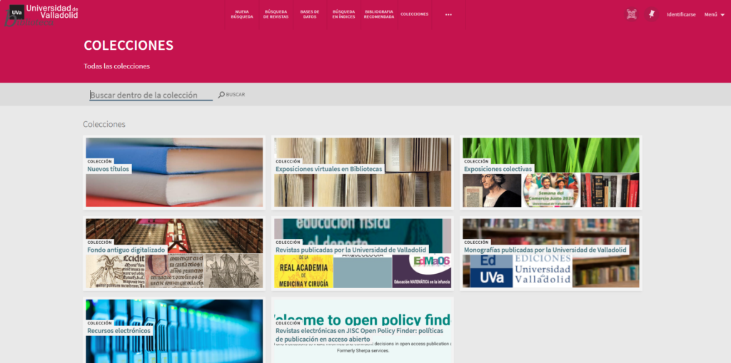 En concreto, «Nuevos títulos» y «Exposiciones virtuales» se organizan en sub-colecciones por cada una de las bibliotecas que componen esta gran estructura que es la Biblioteca de la Universidad de Valladolid y por supuesto encontrarás la Biblioteca de Filosofía y Letras representada.