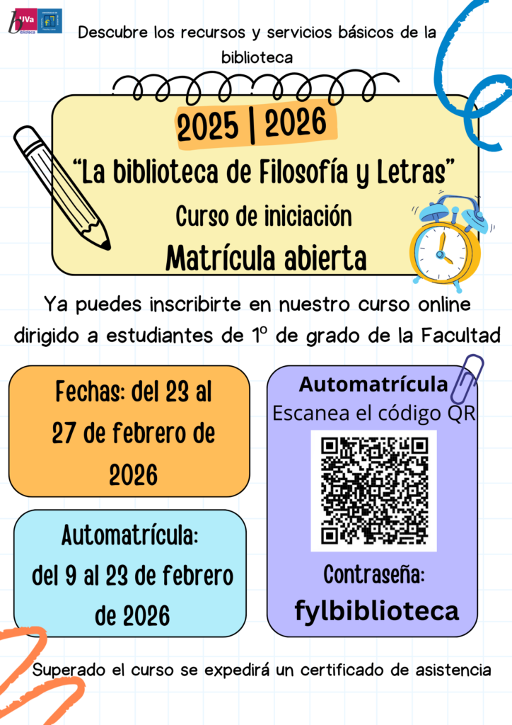 Puedes matricularte del 9 al 23 de febrero de 2026, día en el que comienza el curso. Para ello, pincha en el siguiente enlace (https://extension.campusvirtual.uva.es/course/view.php?id=6460) o lee este código QR, identifícate con tus claves de la UVa e introduce la contraseña fylbiblioteca